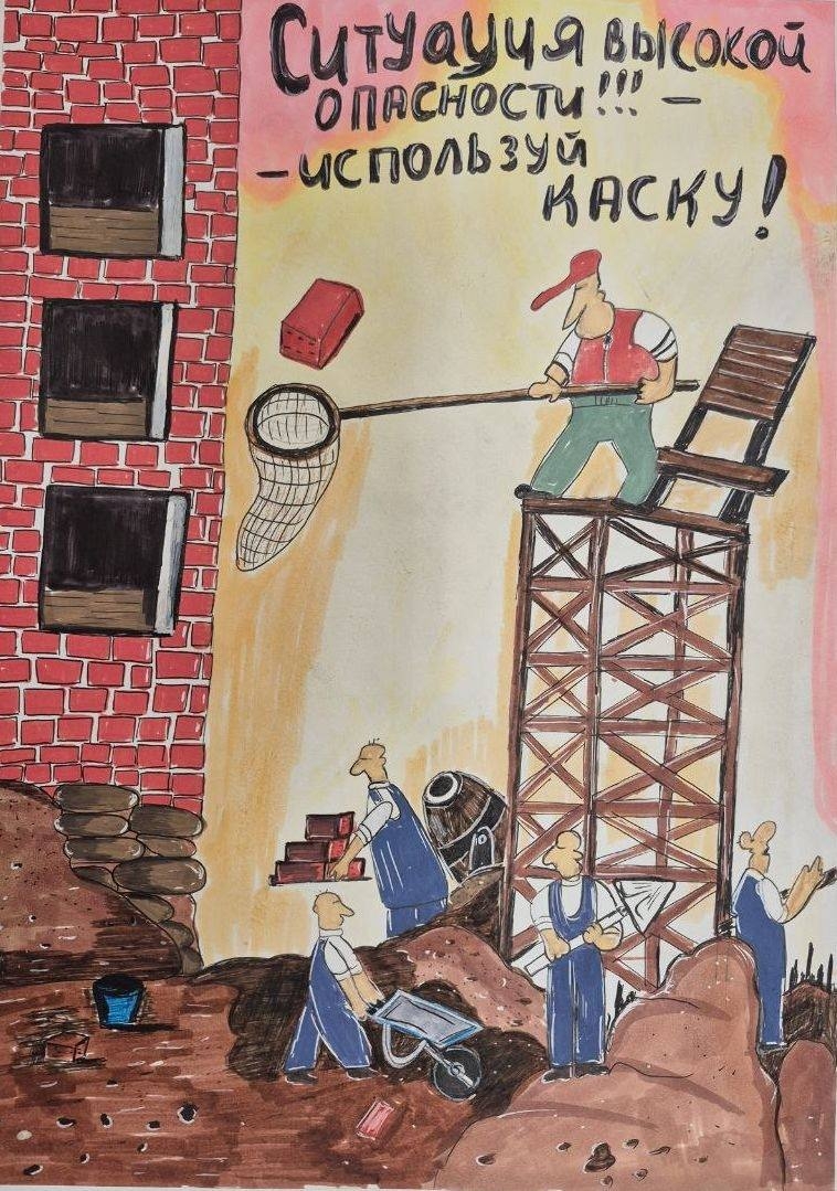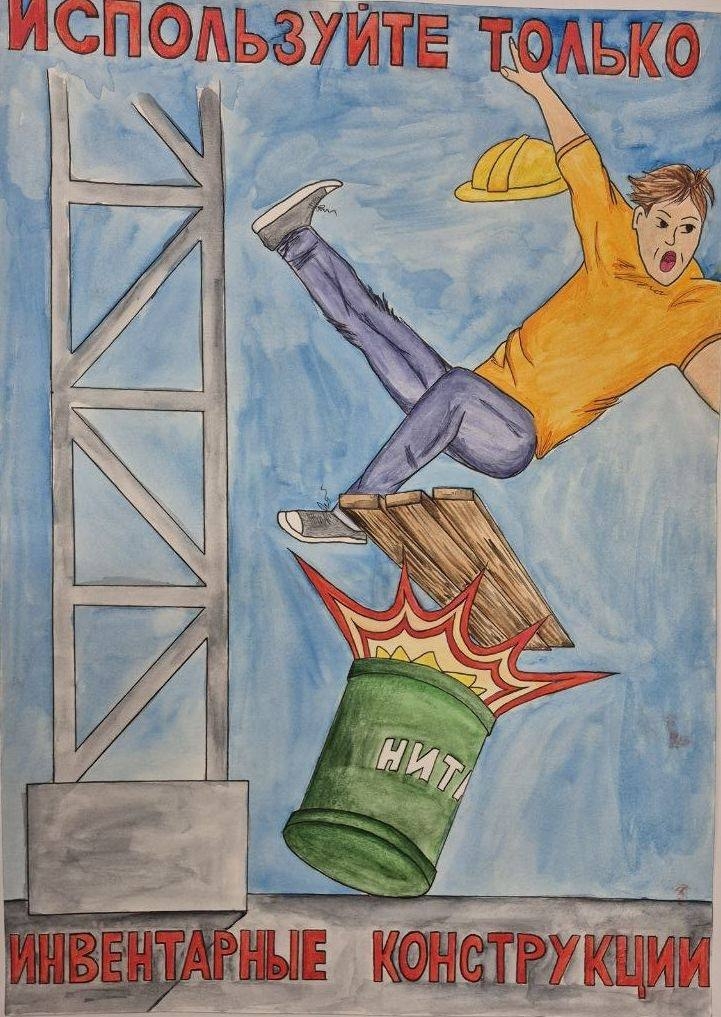 На изображении представлен плакат по технике безопасности. В центре плаката изображён мужчина, падающий с деревянного настила. Он теряет жёлтую каску. Под ним находится зелёная бочка.