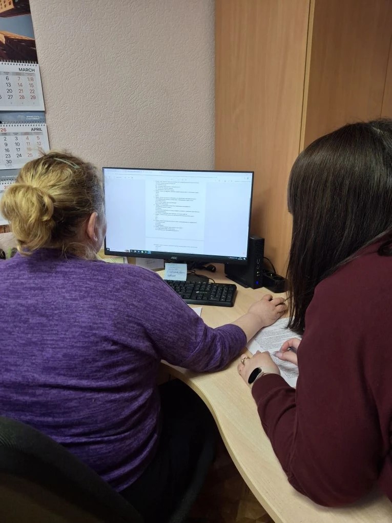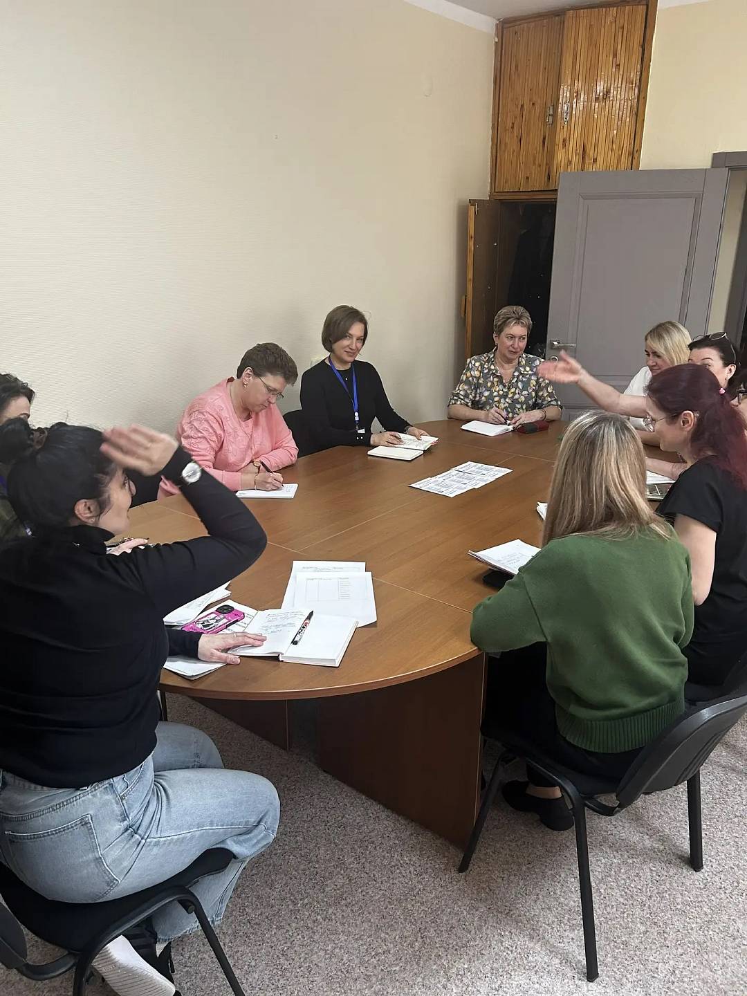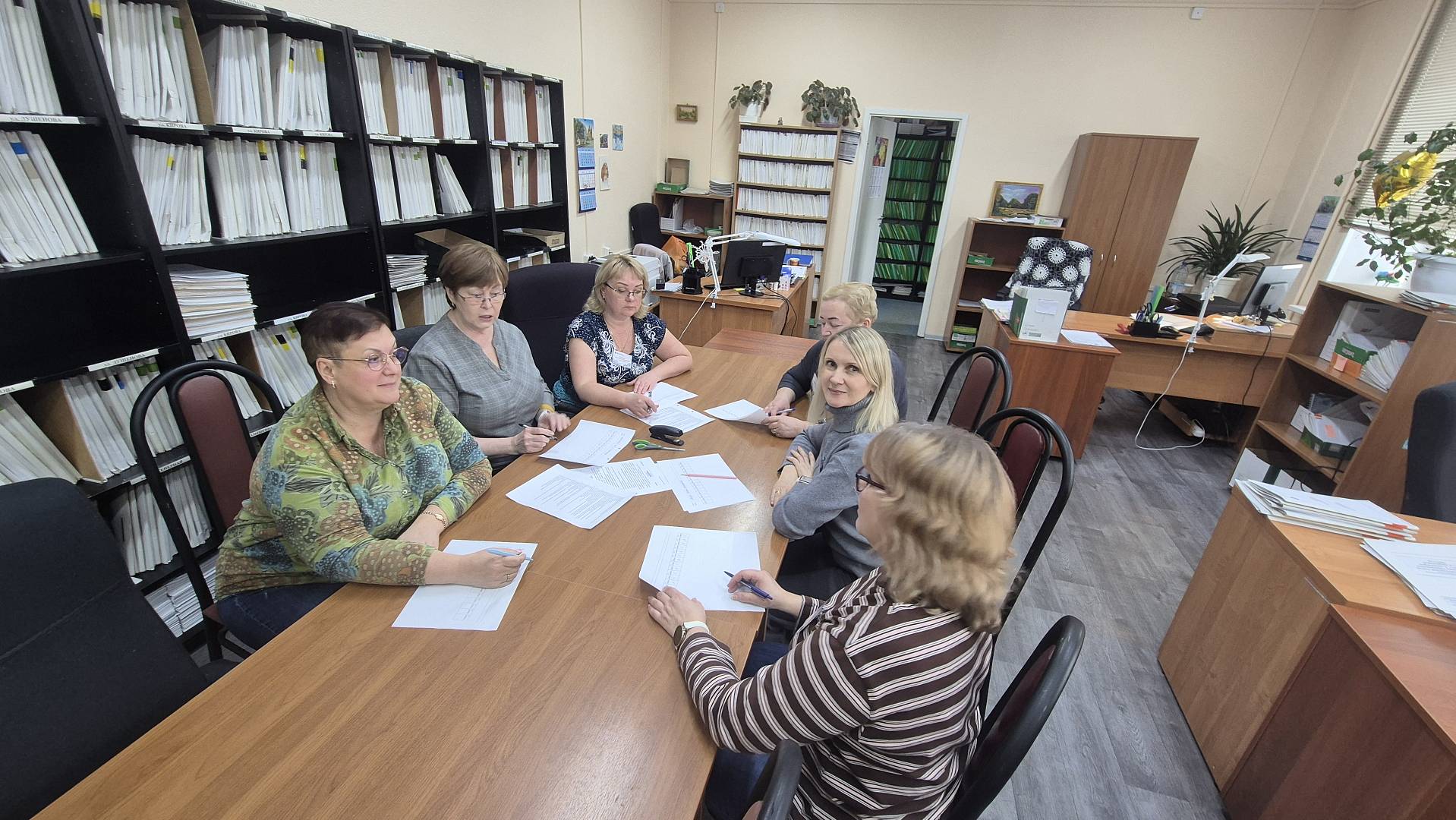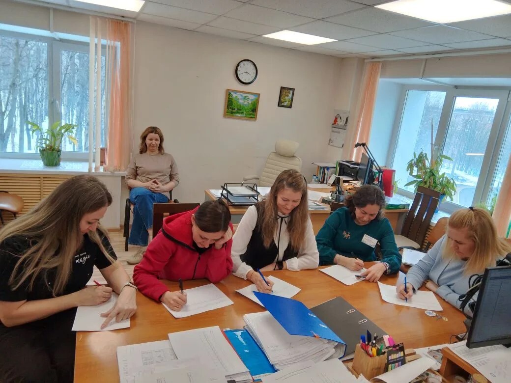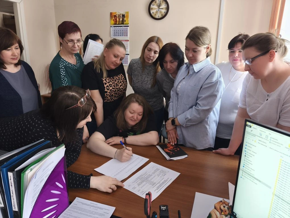 *Альтернативное описание изображения для незрячих и слабовидящих пользователей: В комнате за большим деревянным столом сидят пять женщин, каждая занимается написанием или заполнением документов. На столе разложены различные папки, документы, канцелярские принадлежности, такие как карандаши и ручки. Перед женщинами лежит несколько документов и стопки бумаг.