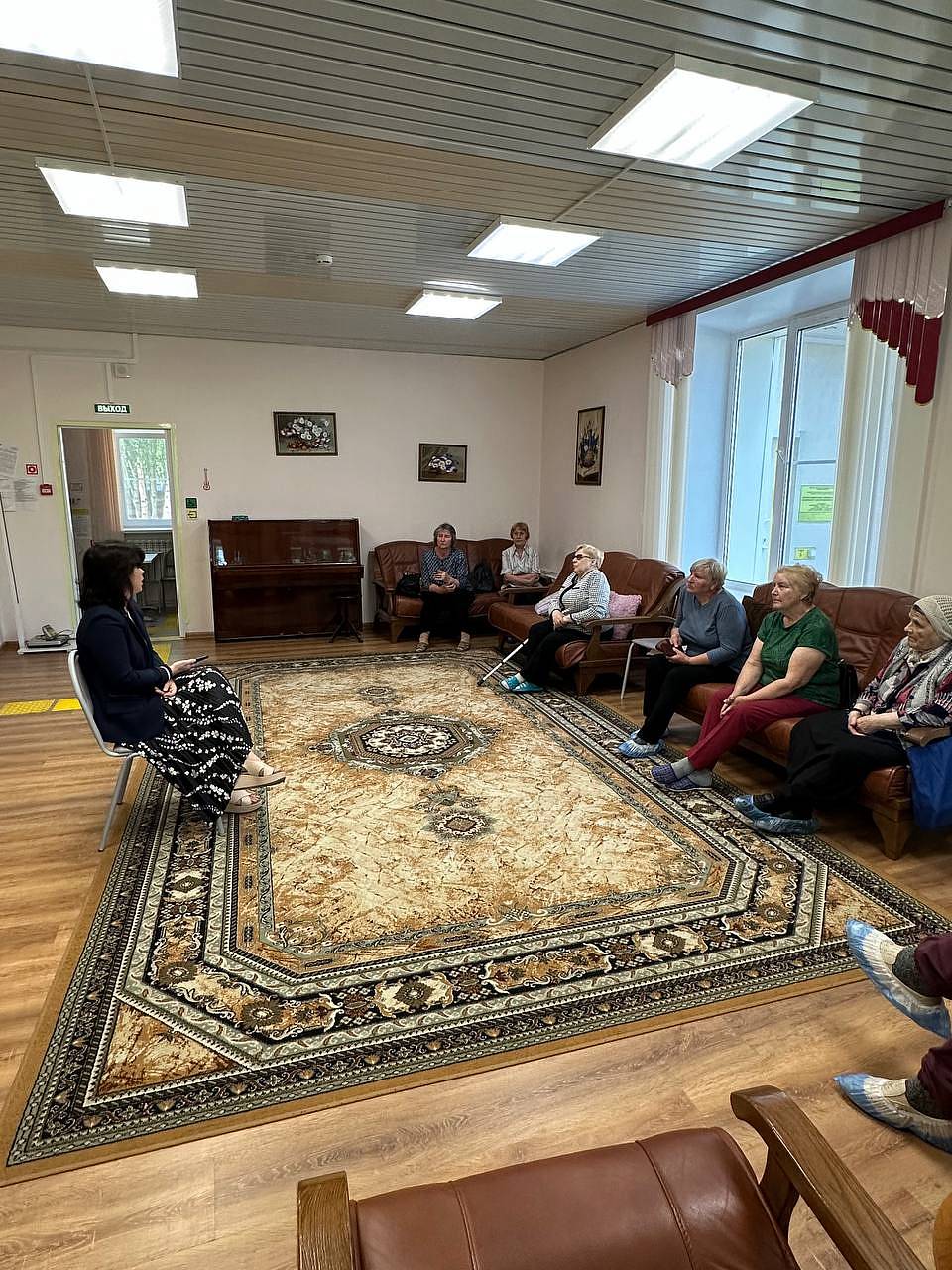 На фотографии изображены шесть женщин, которые сидят на кожаных диванах и креслах коричневого цвета. Одна из женщин держит трость.В комнате есть два больших окна с белыми шторами, украшенными красной отделкой. На стенах светлые обои, а на одной из стен висит картина в золотой раме.