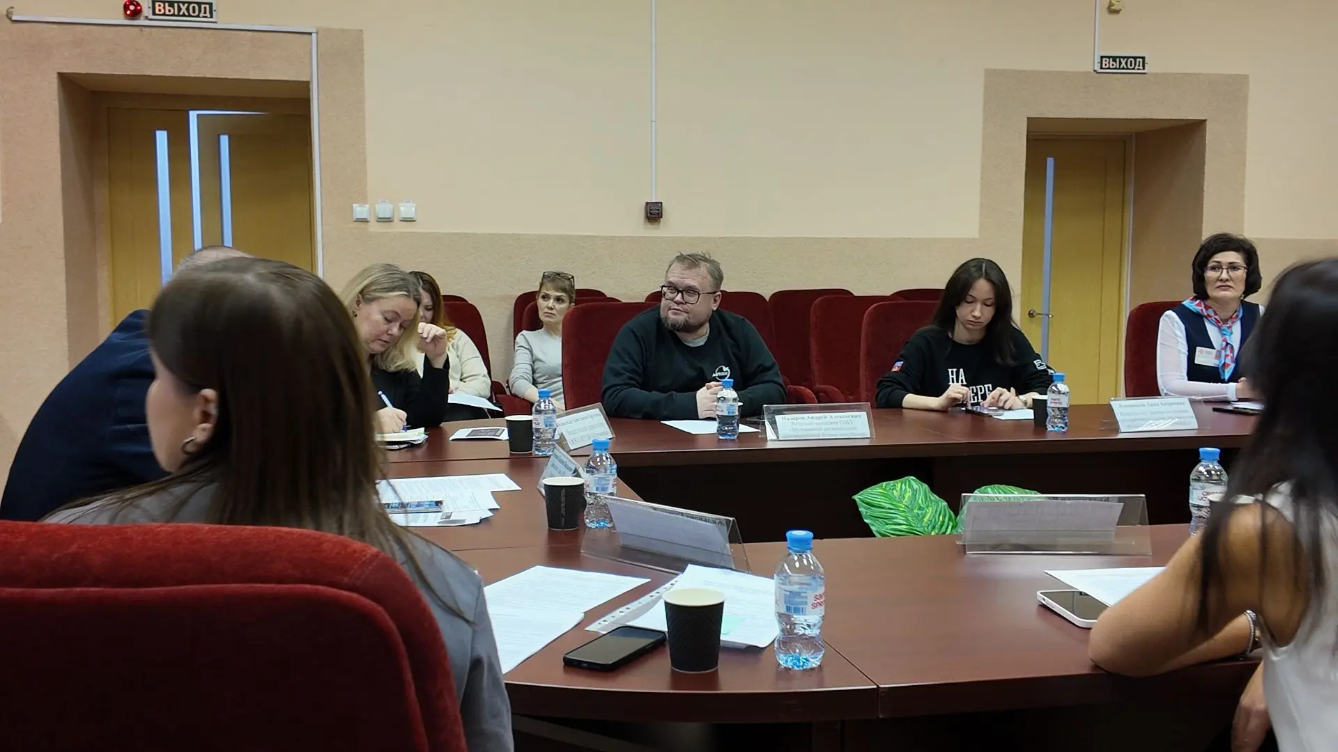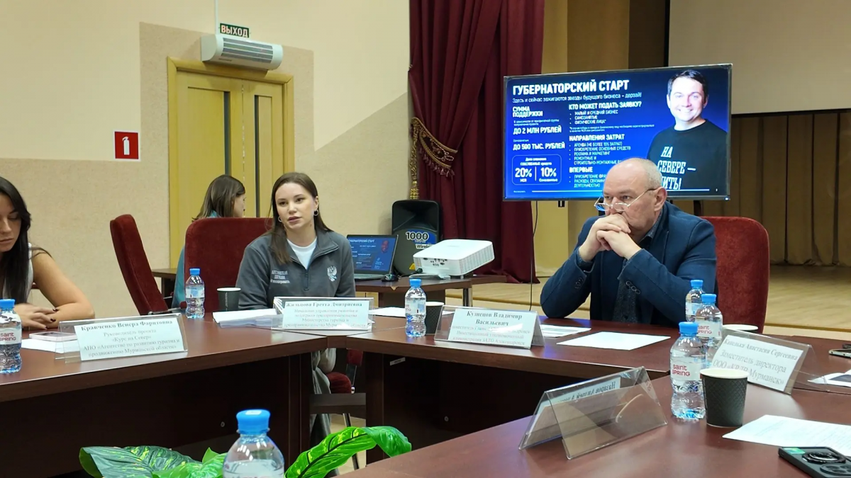 *Альтернативное описание изображения для незрячих и слабовидящих пользователей: В центре фото — большой экран, на котором отображается информация о проекте «Губернаторский старт». Справа от экрана сидит мужчина в очках и синем пиджаке, задумчиво сложив руки у лица. За столом, расположенным перед экраном, сидят несколько человек.