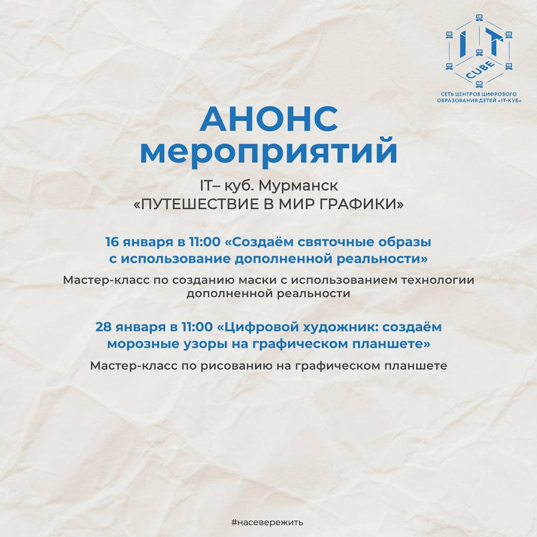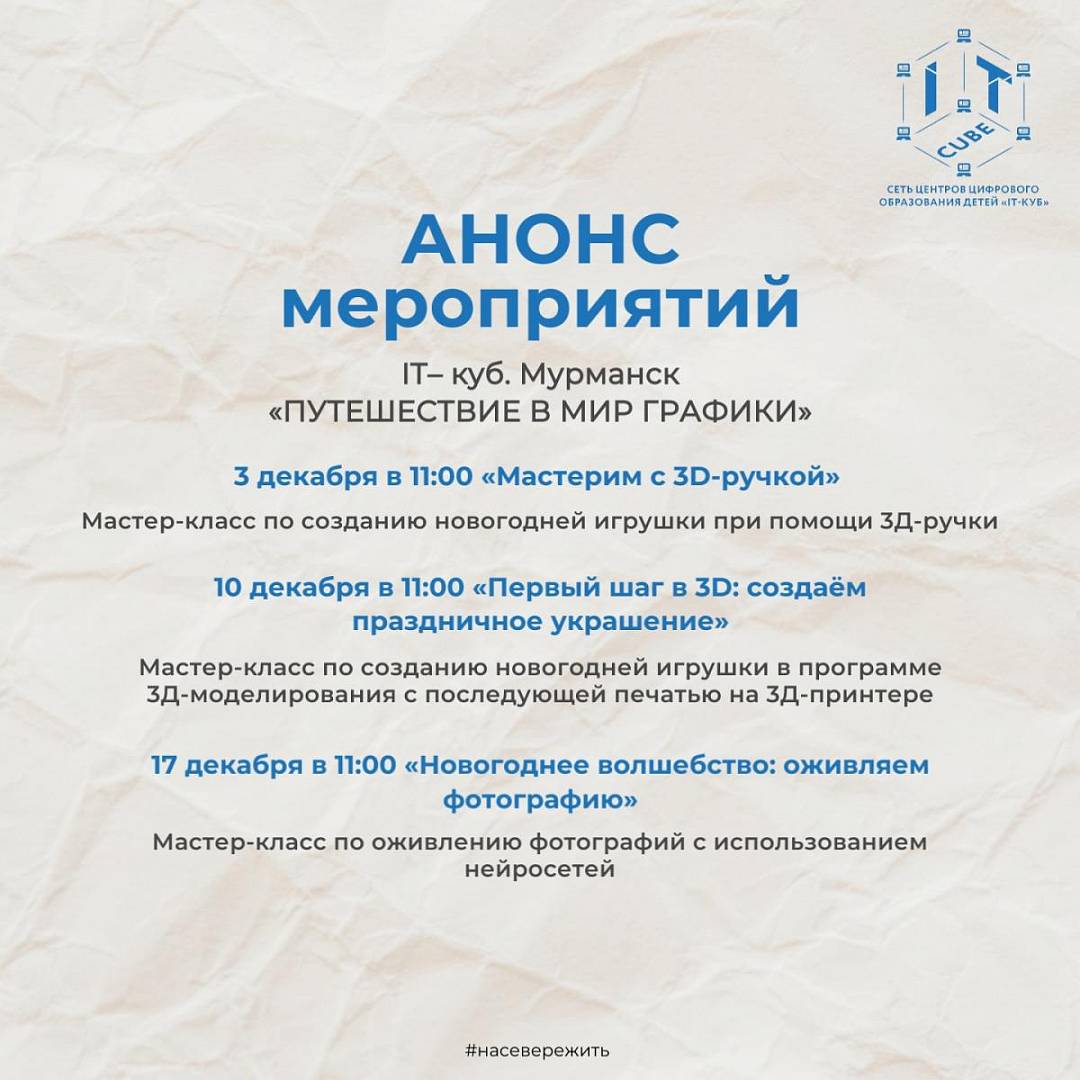 Изображение представляет собой анонс мероприятий IT-куба в Мурманске под названием «Путешествие в мир графики». Это мастер-класс по оживлению фотографий с использованием нейросетей. Внизу изображения есть хэштег «#насевережить» и логотип «IT-куб. Мурманск».