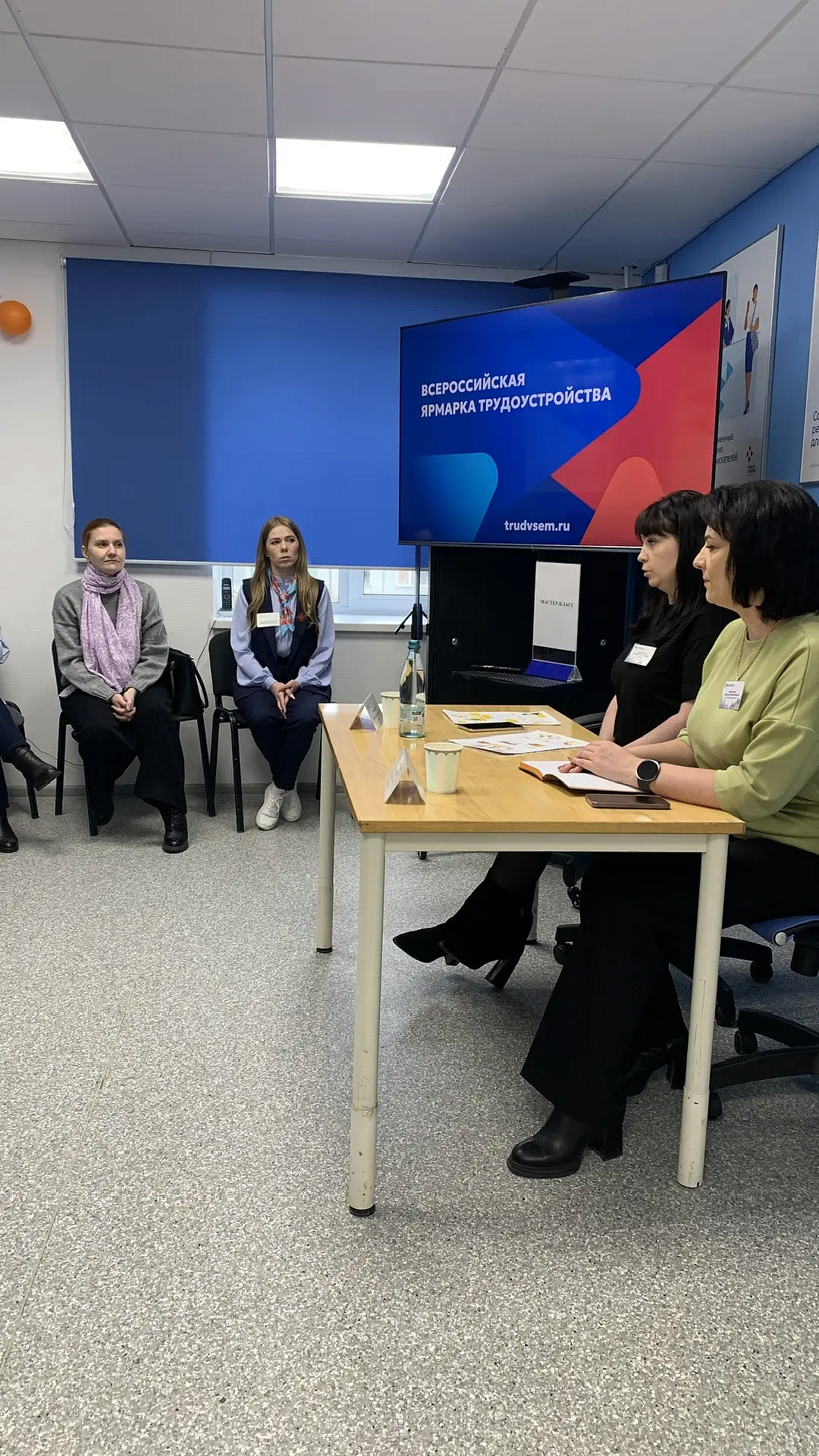 *Альтернативное описание изображения для незрячих и слабовидящих пользователей: На изображении изображена литературная или информационная выставка или ярмарка, посвящённая вопросам трудоустройства и мерам социальной поддержки. В центре композиции расположена стойка или стол, за которым сидят две женщины. На столе размещены различные брошюры, листовки и информационные материалы.