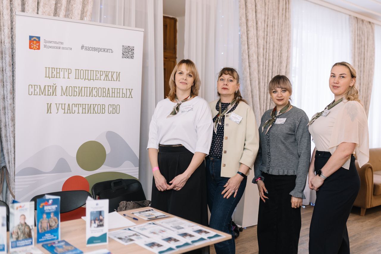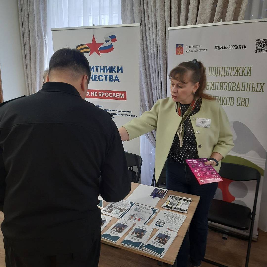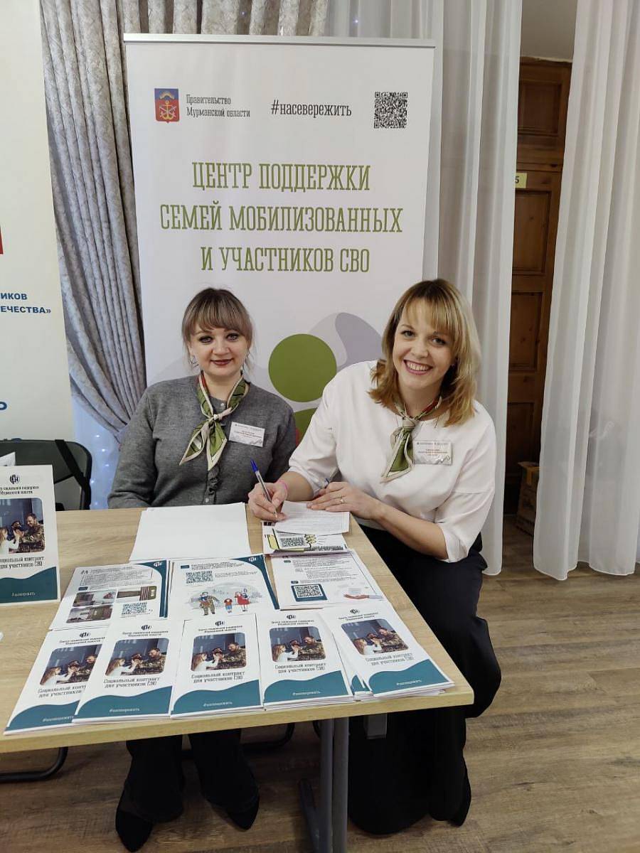 *Альтернативное описание изображения для незрячих и слабовидящих пользователей: Две женщины сидят за столом на фоне стенда. Женщина справа держит ручку и заполняет бумаги. На столе лежат стопки брошюр, на которых написано: «Социальный контракт для участников СВО». На стенде позади женщин изображен логотип правительства Мурманской области, хештег «#насевережить» и текст «Центр поддержки семей мобилизованных и участников СВО».