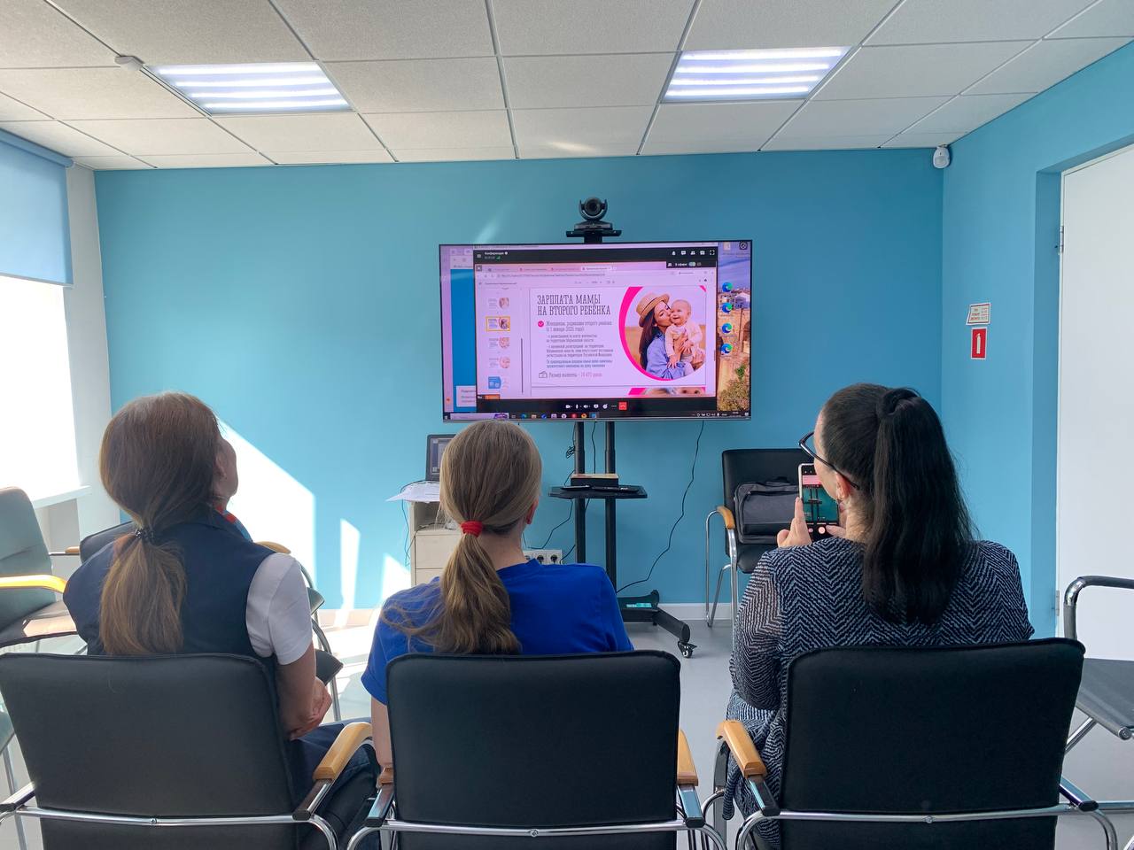 На фотографии изображены люди, которые находятся в комнате. Они смотрят на большой экран, на котором идёт видеоконференция с четырьмя участниками. Участники видеоконференции - женщины. На стене за экраном изображен логотип, состоящий из нескольких красных треугольников.