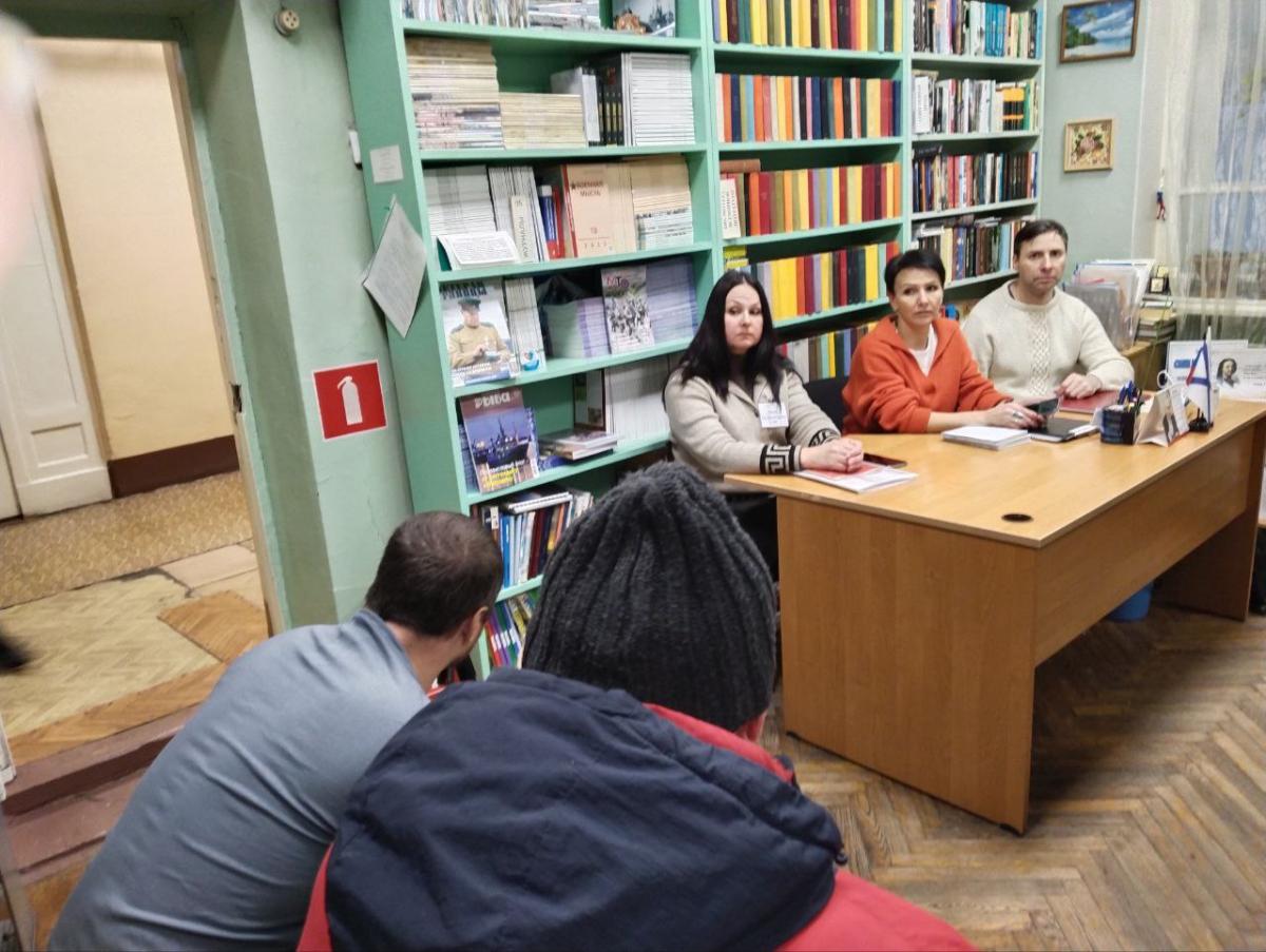 В комнате сидят несколько человек. Перед ними на столе лежат бумаги, ручки, мобильные телефоны и другие предметы. За столом, позади сидящих, находится высокий книжный шкаф, заполненный книгами и журналами.