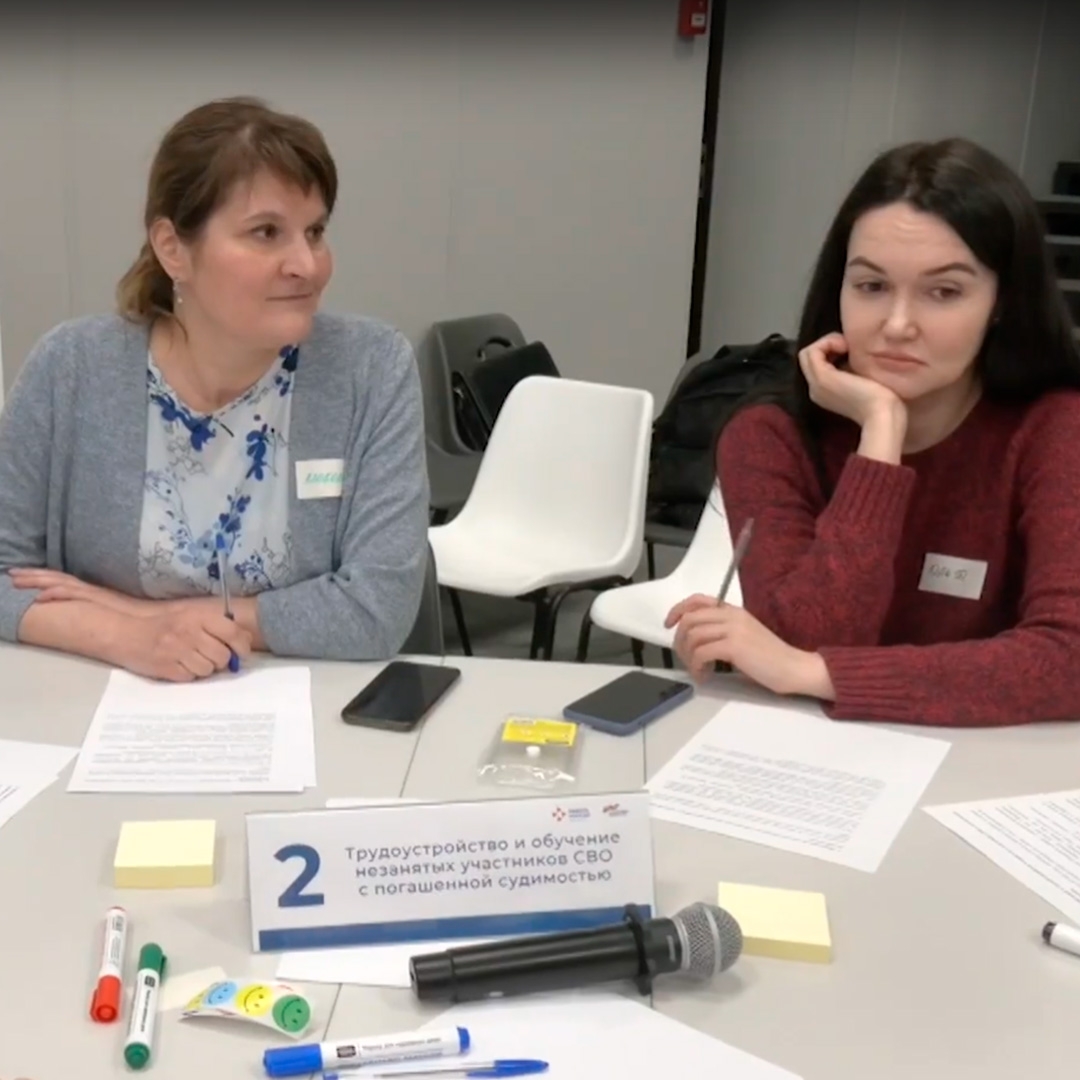 На фотографии запечатлена встреча или конференция, в которой принимают участие две женщины. Они сидят за столом, покрытым серым листом, на котором разбросаны различные предметы. На ней надета блузка с цветочным принтом и серый кардиган. Она держит ручку в руке. Справа сидит молодая женщина с длинными темными волосами, падающими на плечи. На ней надет бордовый свитер с длинными рукавами. Она подпирает подбородок рукой, а другой рукой держит ручку. На столе перед ними лежат различные предметы, включая мобильные телефоны, блокноты с заметками, ручки и маркеры. В центре стола стоит табличка с надписью на русском языке: «Трудоустройство и обучение незанятых участников СВО с погашенной судимостью», а также микрофон.